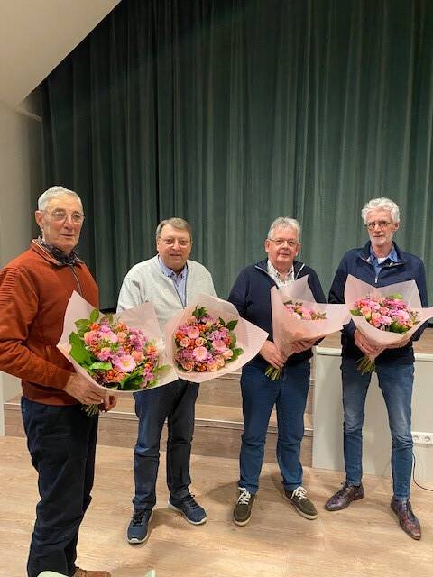 Op dit moment bestaat ons koor uit zeven bestuursleden. Deze leden zitten ook in het mannenkoor. In week 2, 2023 hebben wij afscheid genomen van vier bestuursleden. Deze bestuursleden waren van links naar rechts: Wim van Egmond, Johan Brouwer, Jan Noort en Nico Schoneveld.